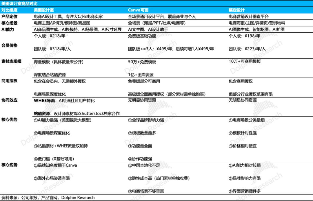 如前文所述,美图设计室依托“站酷+WHEE”生态做to B端的变现。相比国际巨头Canva的通用化定位,美图设计室目前客户组主要是大C小B电商卖家,凭借极具性价比的订阅价格与本土化海量素材,在ROI上具备明显优势;相比竞品稿定设计,美图在主要差一点是底层AI视觉大模型,与独家版权资源上的断层优势。