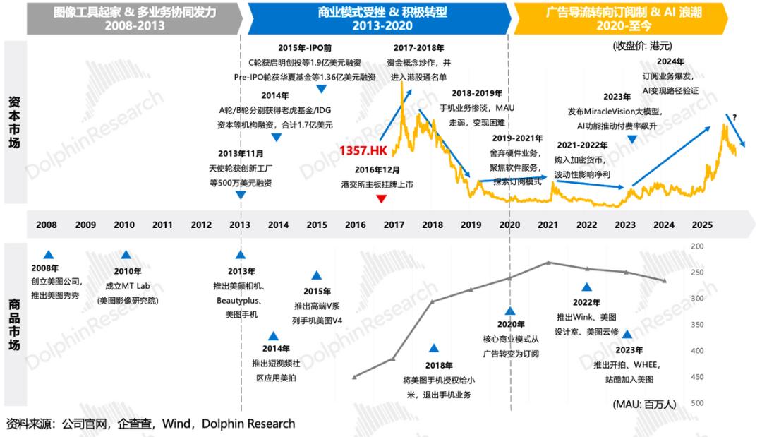 1)2008-2013年 工具切入市场:美图公司于2008年推出美图秀秀PC版,以简单易用的特点迅速占领图片编辑市场。2011年推出移动端应用,抓住智能手机普及红利,用户规模实现爆发式增长。2013年起,公司启动海外市场布局,并扩张产品矩阵,陆续推出美颜相机、美拍等应用。