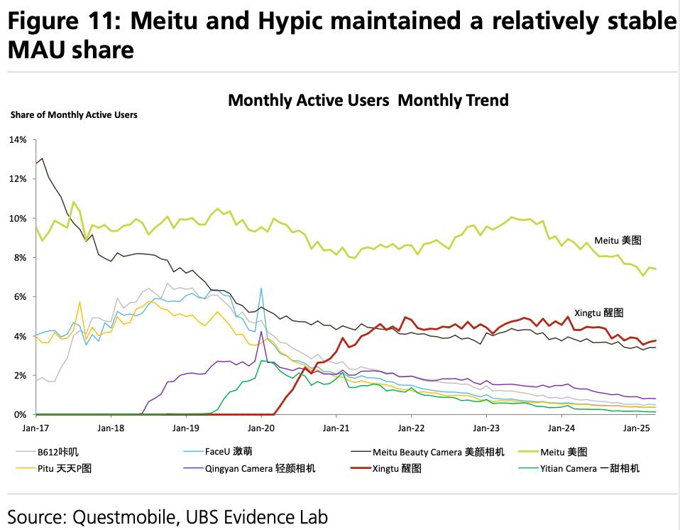 Sensor Tower 2025 年 8 月数据显示,美图系在北美市场 MAU 达 350 万,已超越竞品跃居第一;欧洲市场仅次于 FaceApp 稳居第二,显著领先于 Facetune。