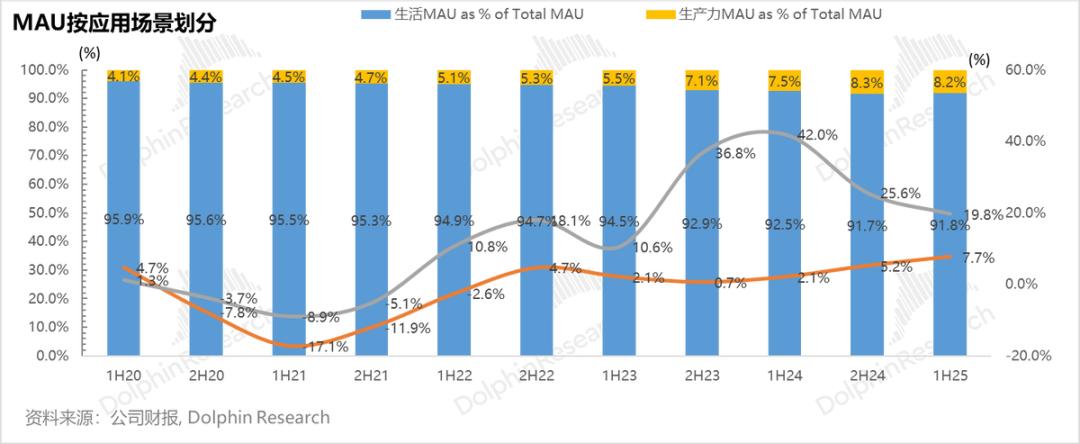 a. 生产力场景经历了多个报告期的强劲渗透,其MAU占比从1H20的4.1% 一路攀升至2H24的8.3%。然而进入1H25,该板块占比与增速的双重回落:一方面,生产力MAU占比微幅回调至 8.2%;另一方面,生产力MAU的同比增速从峰值 42.0% 连续两个报告期显著放缓,至1H25已降至 19.8%。