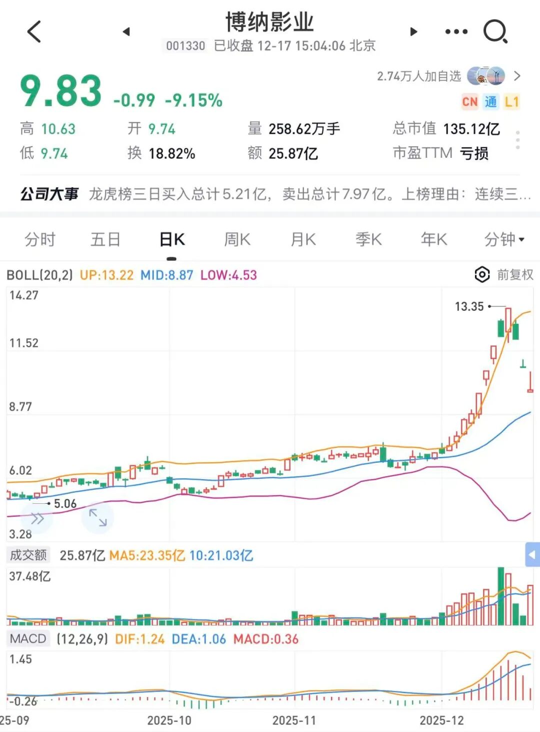 然而,这轮上涨并未形成趋势性行情。随着预售数据与影片口碑逐步落地,资本市场的态度也迅速转向。在15日、16日连续2日跌停后,17日博纳再次收跌9.15%,前期涨幅被大幅回吐。