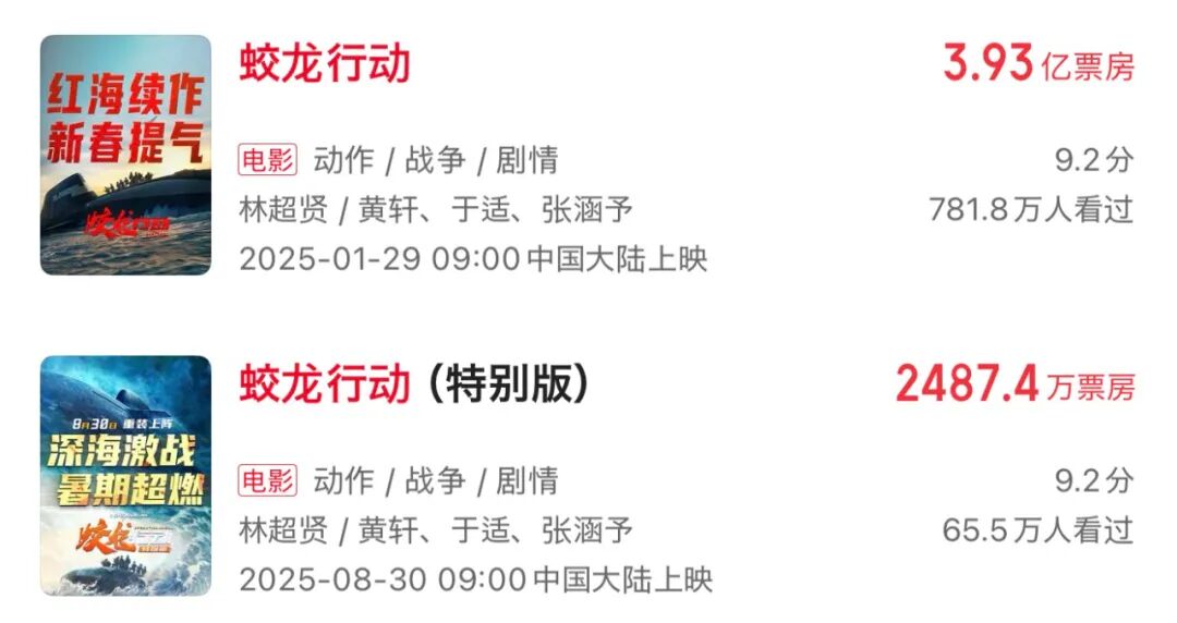 2025年春节档,由博纳出品的《蛟龙行动》票房不足4亿元,市场反响低迷。此后,影片一度撤档重新剪辑,并改于8月30日以《蛟龙行动(特别版)》再度上映,而此次上映的票房仅不足3000万元。