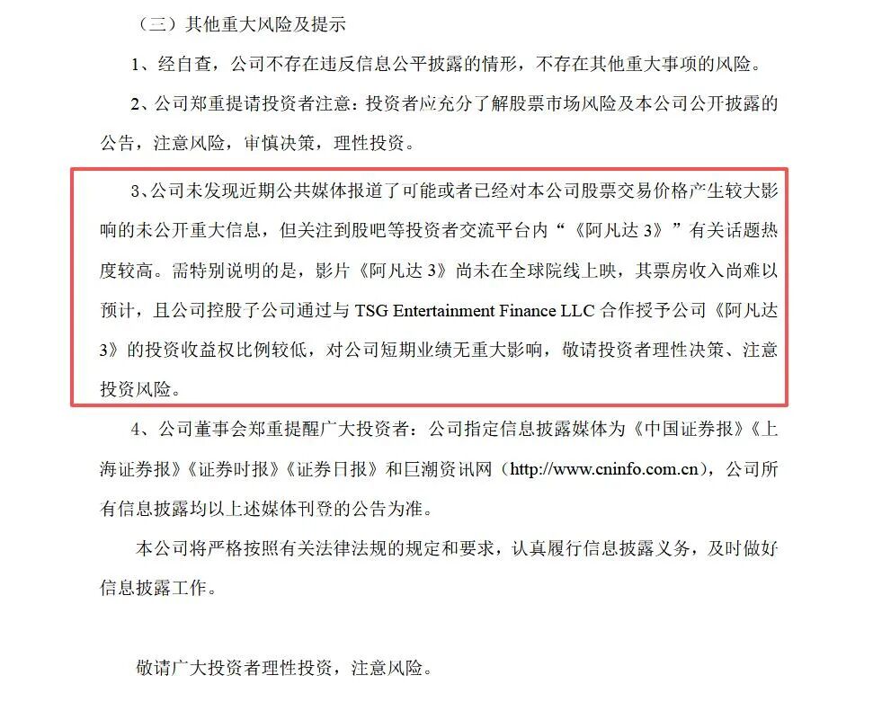 但需要明确区分的是,博纳与《阿凡达3》的关系,本质上是一种投资收益安排,而非主控、主投或深度参与制作。这意味着,其最终收益高度依赖影片的全球票房表现、分账规则及结算周期,并不具备完全确定性。对此,公司在多份公告中亦反复进行过风险提示,只是在股价快速拉升阶段,这些信息并未成为市场关注的重点。