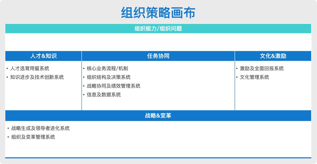 其中S5是组织策略的关键呈现,我们会用一张组织策略画布把组织策略进行结构化表达。