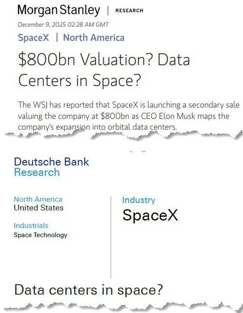 在SpaceX确认有意明年进行首次公开募股(IPO)据称寻求1.5万亿美元估值,以及马斯克强烈支持在太空部署数据中心之后,连华尔街卖方机构也开始深入研究起了这一概念。