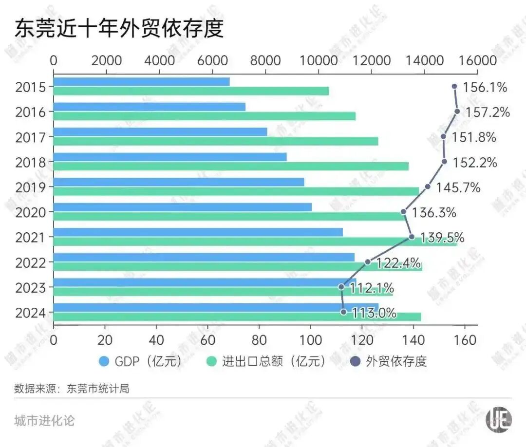 外贸一直被视为衡量东莞经济的“晴雨表”。东莞外贸依存度(进出口总额/GDP)一度超过400%。2024年,这个数字降至113%,较前些年有明显下降,但仍是全国外贸依存度最高的城市之一,在万亿城市中仅次于深圳(122.4%)。