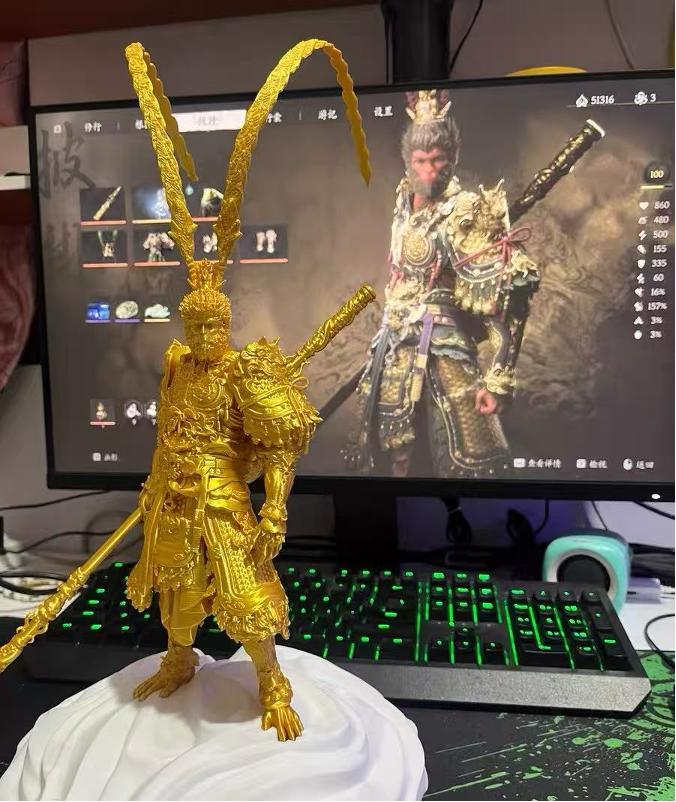 “我现在基本上都是在做成品,包括打印、组装、打磨、喷漆/手绘上色。代打就是图个方便。”代琰成交的第一单是《黑神话:悟空》的“天命人”套装,售价108元,耗时2天多。“那会儿刚开始不是很懂,还有模型打坏的情况。这个108元的价格其实算是低的,因为这个模型拆支撑很难,要拆很久,而且用的是丝绸料。”他告诉惊蛰研究所,这个套装最初的定价其实是158元,但没人买,于是就降到了108元,也是抱着先成交的心态。