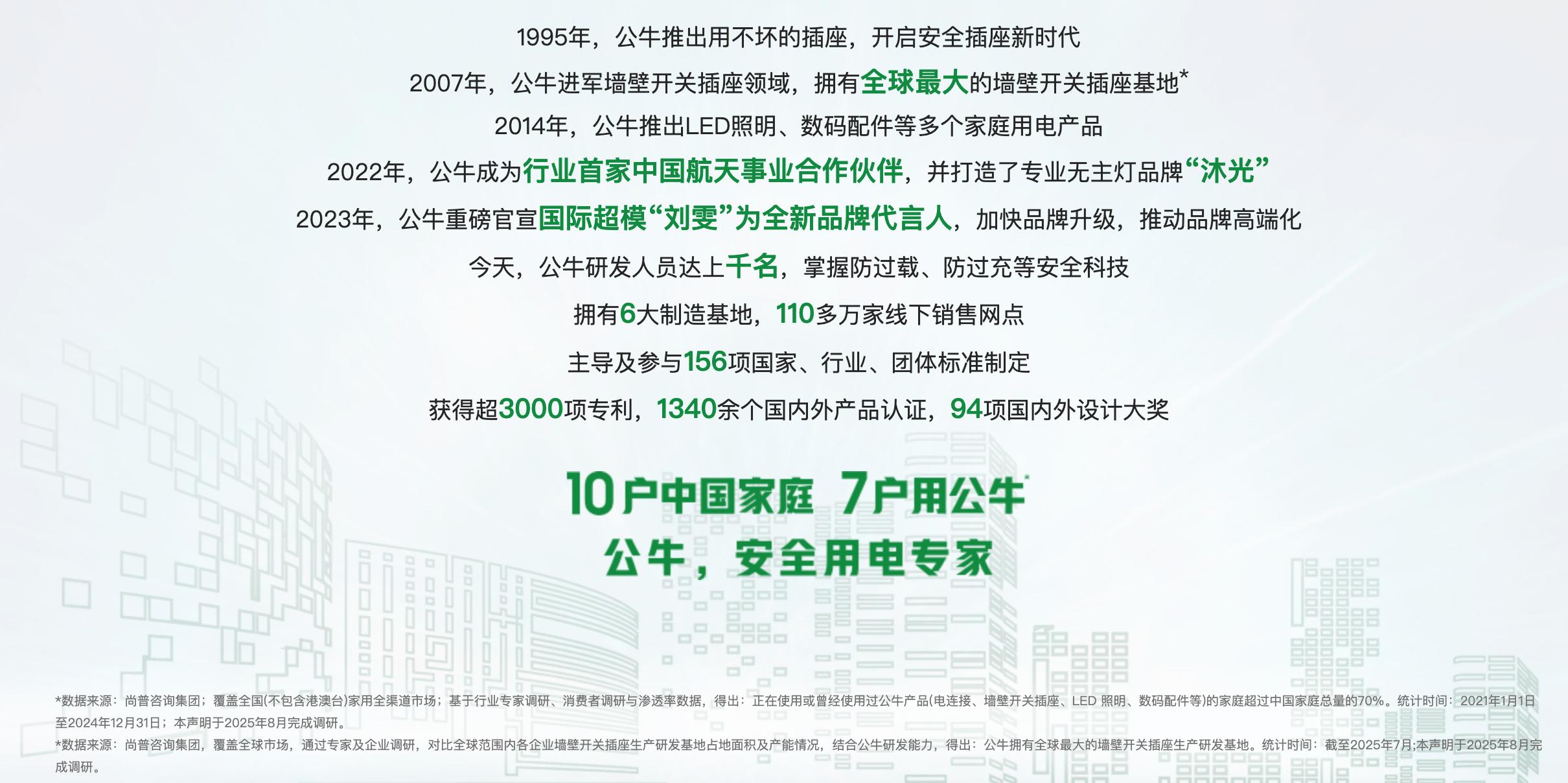 在公牛集团官网,可以很明显地看到“10户中国家庭,7户用公牛”的广告语,而在该广告语下方有两行小字,写着“数据来源:尚普咨询集团;覆盖全国(不包含港澳台)家用全渠道市场;基于行业专家调研、消费者调研与渗透率数据,得出:正在使用或曾经使用过公牛产品(电连接、墙壁开关插座、LED 照明、数码配件等)的家庭超过中国家庭总量的70%。统计时间:2021年1月1日至2024年12月31日;本声明于2025年8月完成调研。”