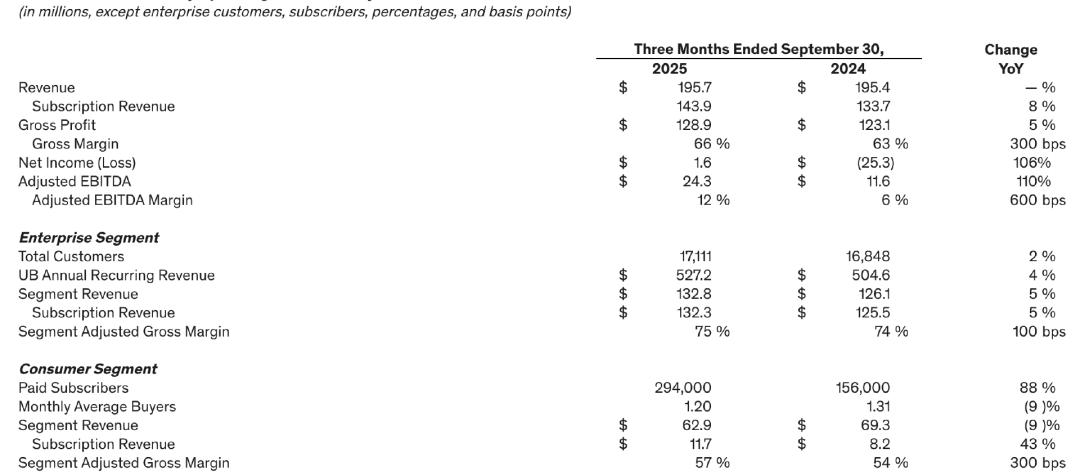根据财报,Udemy 2025年第三季度营收1.957亿美元,同比增长0.13%;净利润为164.2万美元,同比增长106%。