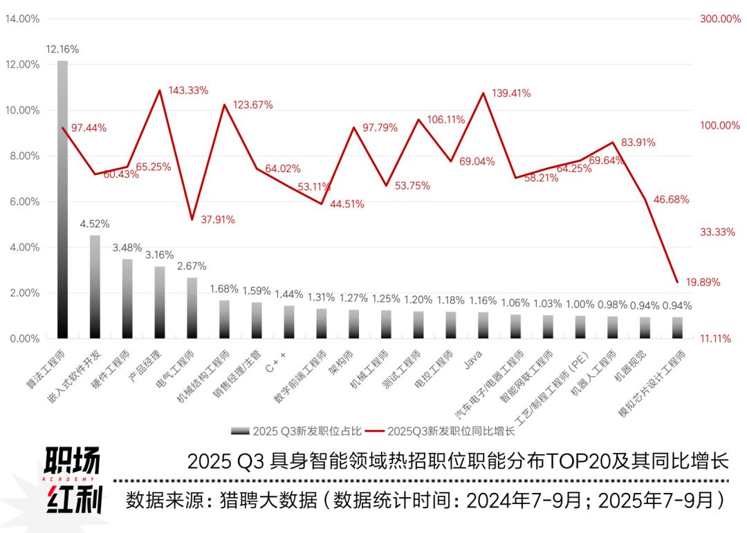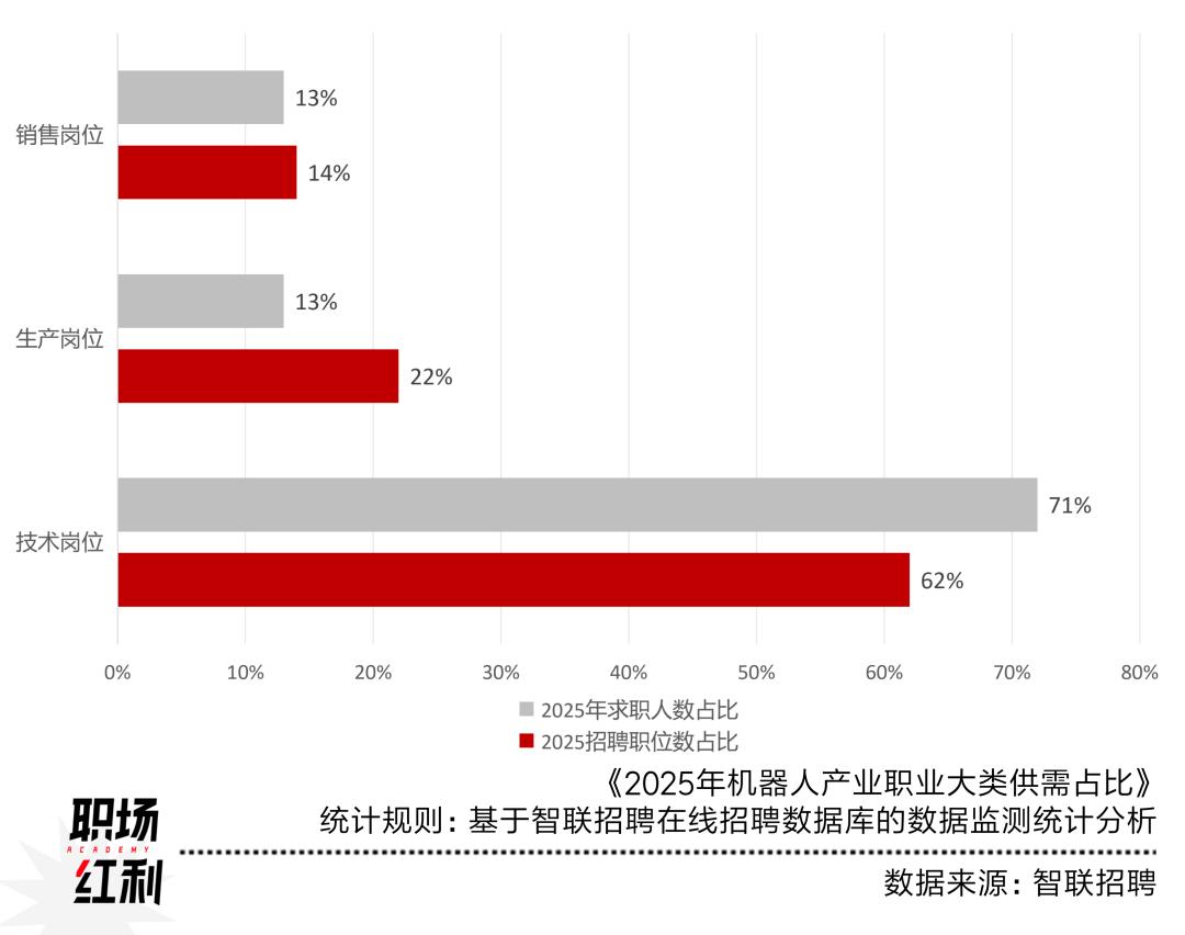 据智联招聘数据,2025年机器人产业招聘需求同比增加6%,求职人数激增32%,其中人形机器人领域职位增长409% ,技术岗位占比62%。
