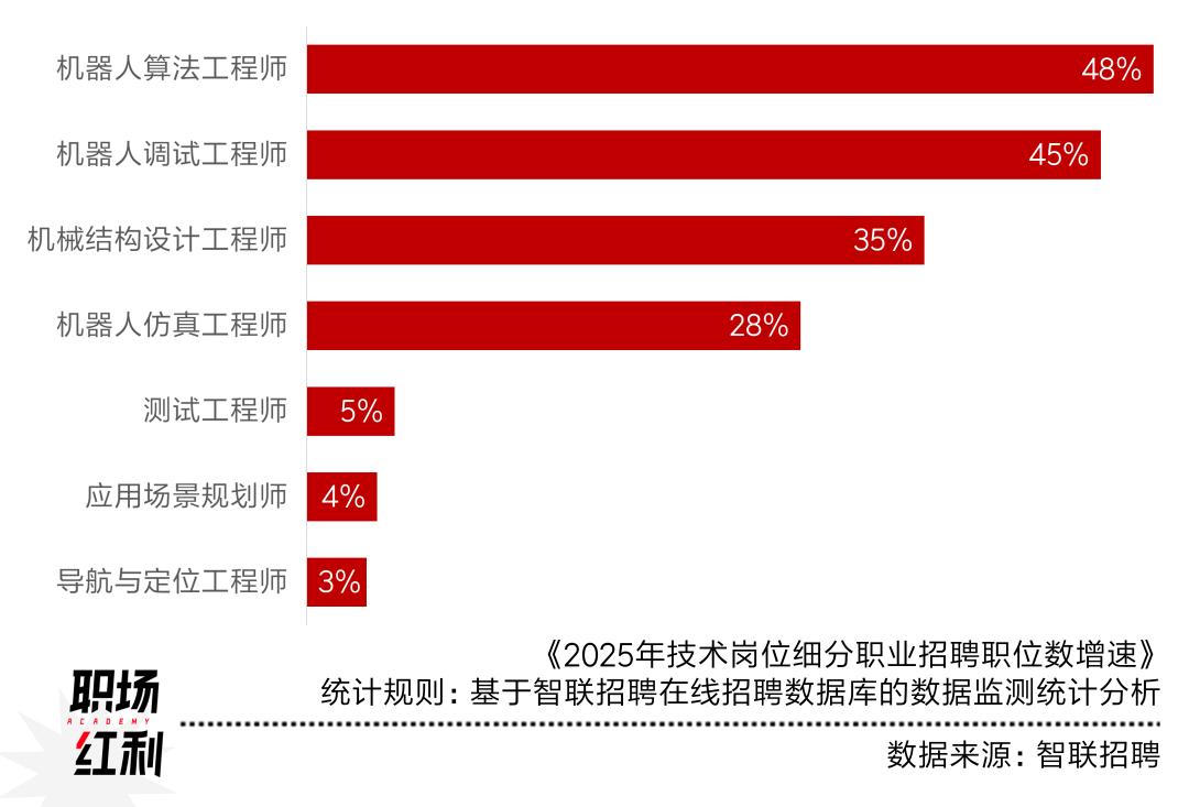 产业规模化落地的推进,也催生了旺盛的人才需求。2025年1-5月,机器人产业招聘量同比增长6%,其中人形机器人激增409%;技术岗占全部岗位62%,算法、机械、电控、运维需求告急。