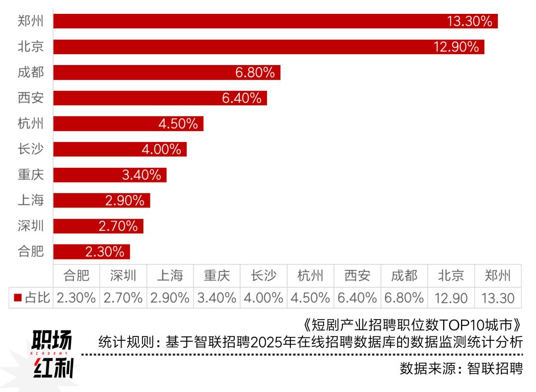 今年春季,职场Bonus曾在《短剧出海人才裂谷》、《从富士康到短剧,郑州还在拼“人海战术”》两篇报道中详细关注微短剧职业和出海趋势、城市发展之间的红利关联。从国内城市的产业聚集度来看,一批二线城市的机会正在变多。2025年前三季度,郑州的微短剧相关职位数占比13.3%,排全国第一,需求比去年同期涨了75.6%;北京紧随其后,占2.9%,增速36.4%;成都、西安的需求也有缺口,分别增长了44.4%和127.9%。