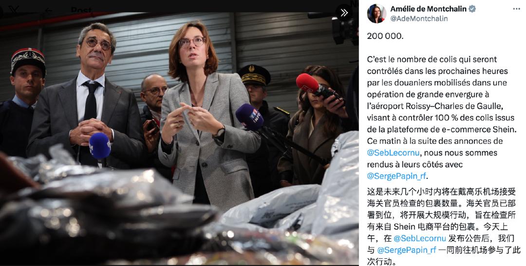 ● 法国公共账户与公共行动部长Amélie在视察SHEIN包裹的X帖子