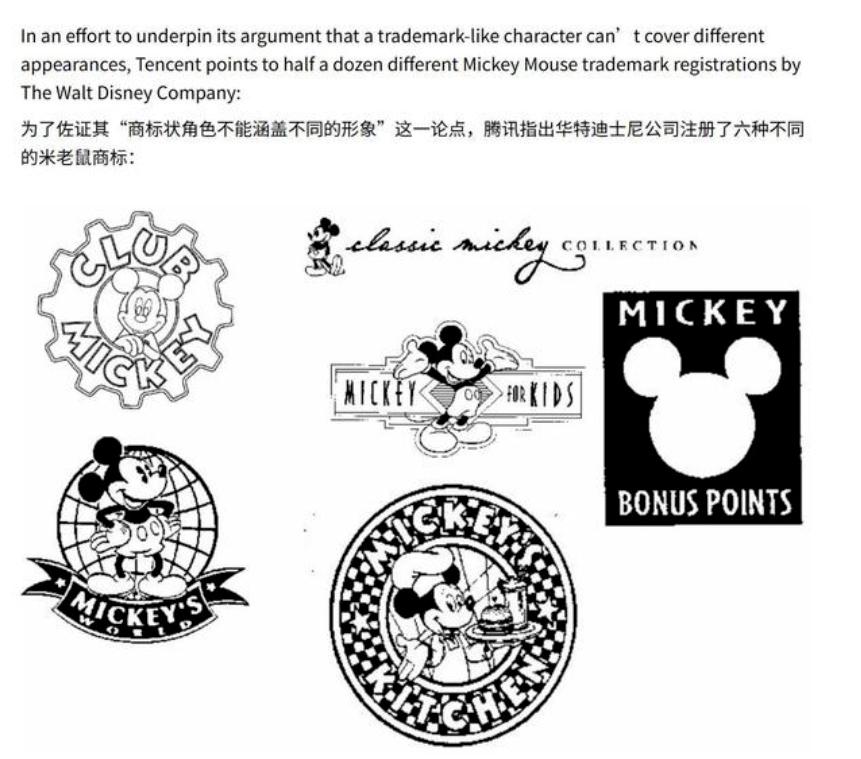 腾讯借米老鼠提出 “商标状角色不能涵盖不同形象” 图源:腾讯提交的法庭文件