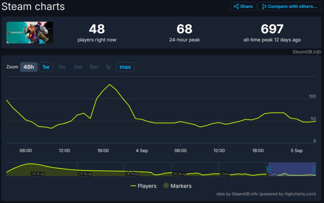 《星鸣特工》正式版在线人数峰值不足700 图源:SteamDB