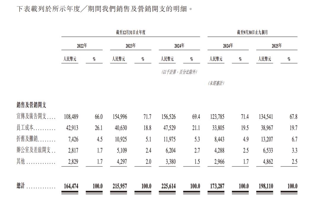 2022年-2024年以及2025年前9个月,公司的销售及营销开支分别为1.64亿、2.16亿、2.26亿以及1.98亿,占总营收的比重分别为18.1%、20.7%、21.6%以及22.6%。这既体现了品牌对流量获客的高度依赖,也折射出健康个护赛道日益激烈的竞争格局。