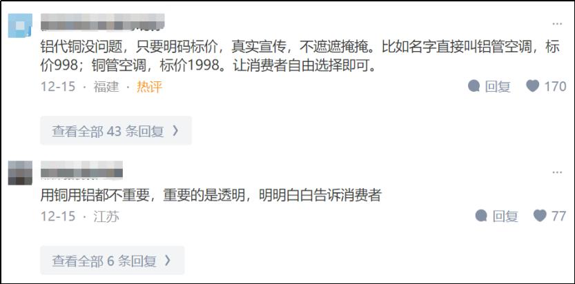 比起“铝代铜”可能带来的质量问题,消费者更担心的是“虚假宣传”和“以次充好”。“铝代铜”之后,宣传时藏着掖着,并且依旧卖着传统空调的价格,这应该才是消费者最在意的雷区。
