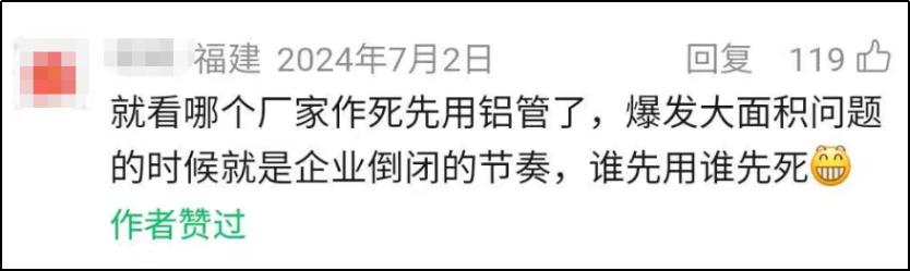 有媒体发文写道,曾经某空调龙头企业就因为尝试采用铝连接管和铝管两器,被竞争对手当做是“以次充好”的例子大力宣传,甚至委托拆解博主进行拆解曝光,博主一句话“全是铝的,真心在骗人啊”,直接把该企业打成了不良厂商。