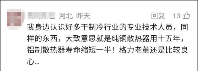 不仅是在最近明确拒绝“铝代铜”,去年6月董明珠就曾在股东大会上表示:铝在耐久性、稳定性上,不敢保证。没有100%保证,就不能用“铝代铜”。一旦售后出问题,消费者痛苦,企业也痛苦,所以当下坚决用铜,宁可少赚点钱。