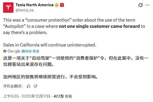还在X平台上发布声明,称这是一项关于“自动驾驶”一词使用的“消费者保护”令,但在此案中,没有一位顾客站出来说存在问题,因此,加州地区的销售将继续照常进行,不会受到影响。