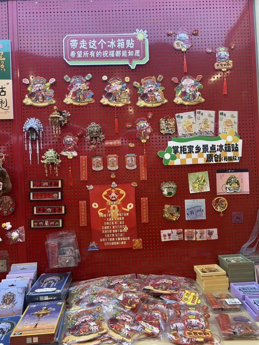 秉持着「来都来了」的原则,他掠过一整面墙的刻着吉祥话的冰箱贴,最终将视线落在了财神盲盒上。在配有龙腾图纹的金色柜子上,财神盲盒49.8元的单价被衬托得颇具亲和力,完全可以忽略浙江产地的身世。他爽快地买了3个,临走前还依依不舍地在「指谁谁发财」的灯牌下合影,并感叹:这是个商机。