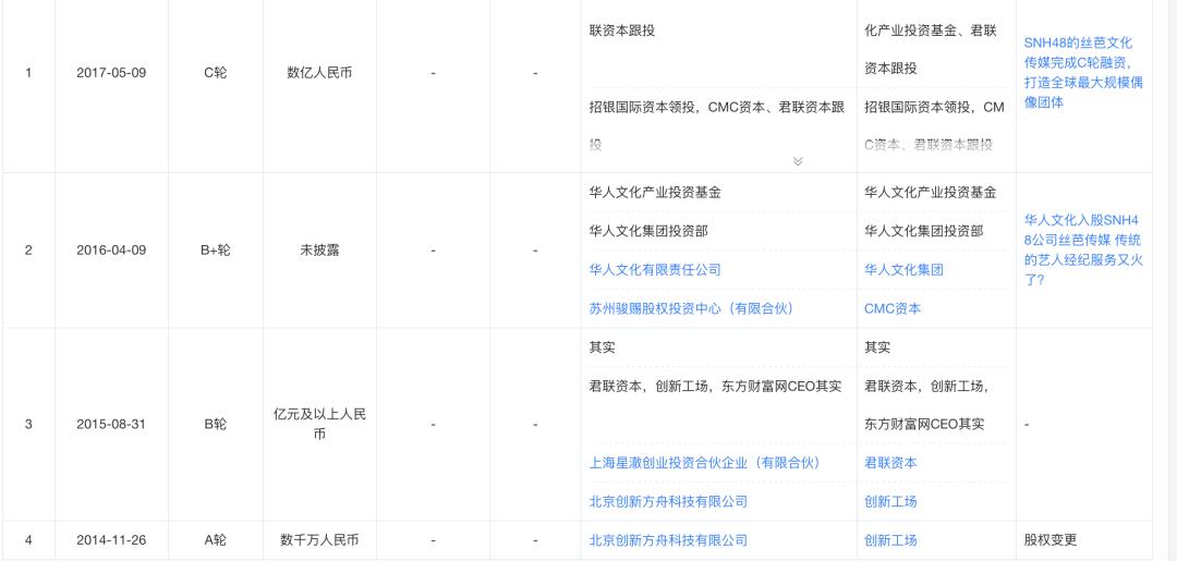 2015年8月,丝芭传媒完成亿元人民币级别的B轮融资,由君联资本领投,创新工场跟投。君联资本是联想控股旗下专业风投公司,在文化娱乐、消费升级等领域布局广泛,具备产业资源与专业投资团队,能为被投企业提供多方面支持。