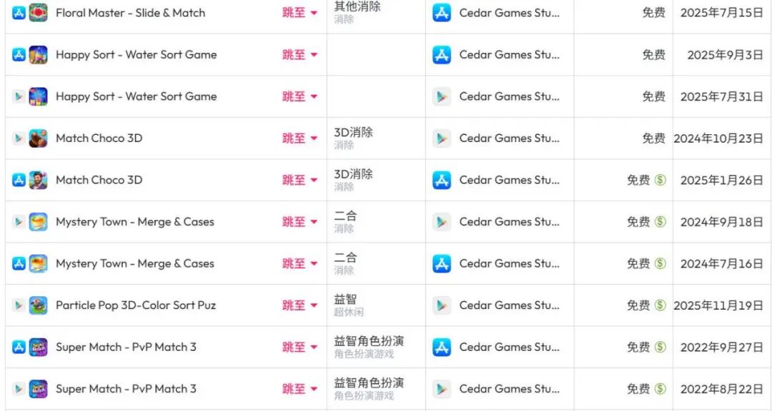 Cedar Games Studio 曾发行多款国内厂商开发游戏,但大部分都已经下架 | 数据来源:AppMagic