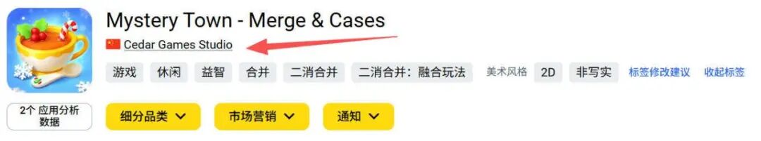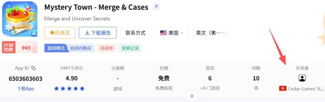 「Mystery Town」的发行账号显示为 Cedar Games Studio,点点数据显示注册地为中国香港 ( 上图 ),AppMagic 显示为中国内厂商账号 ( 下图 ) | 图片来源:点点数据、AppMagic