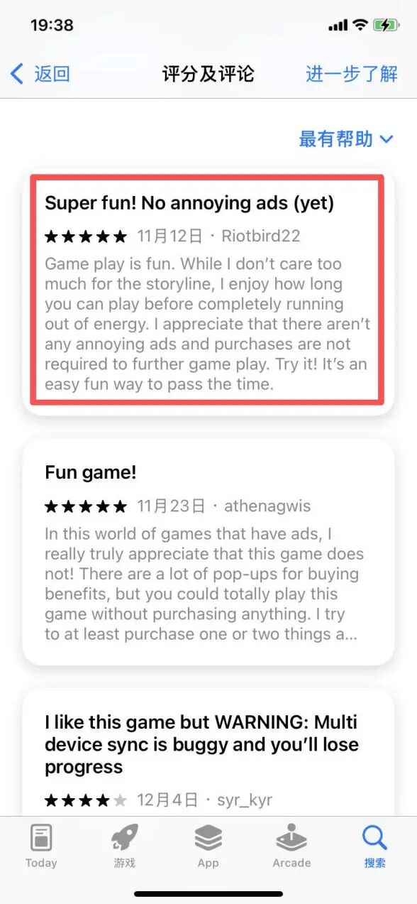 App Store 上的最高赞回答重点表扬了游戏的资源分配充足 | 图片来源:App Store