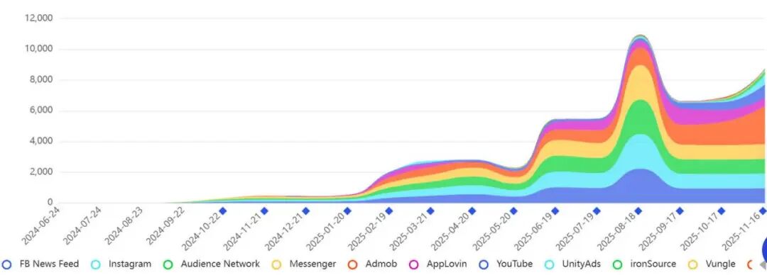 游戏 Google Play 端的素材投放从 2025 年 1 月下旬开始逐渐增长,在 8 月中旬达到最高峰,和月流水明显增长的时间点基本吻合 | 数据来源:广大大