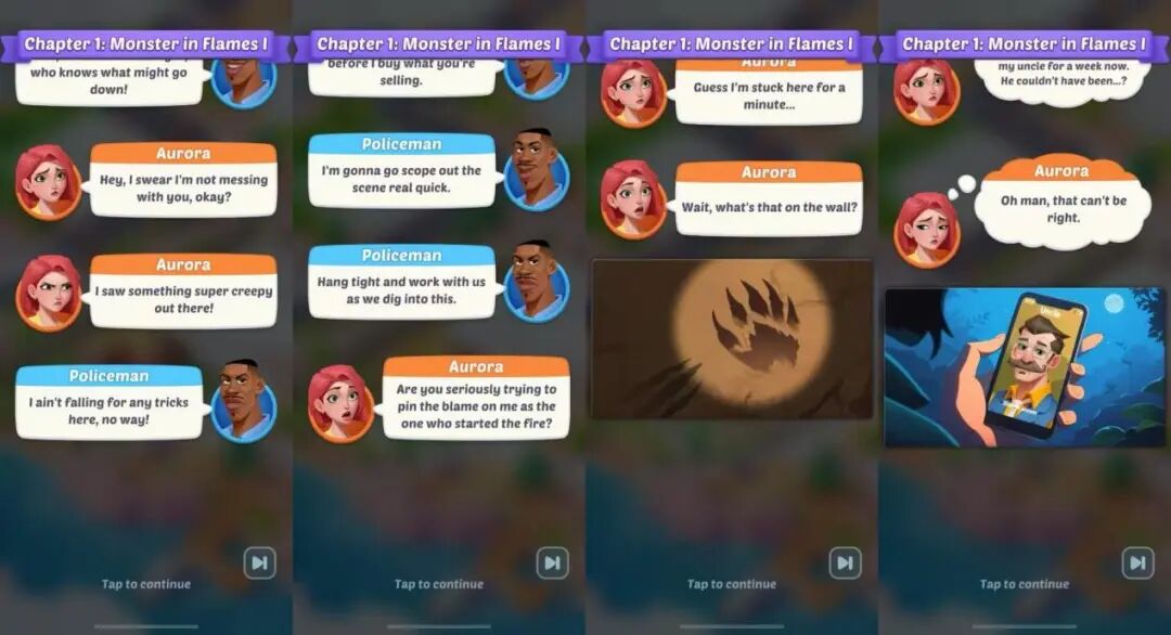 这么多次尝试之后,为什么能跑出流水的是「Mystery Town」?在体验后我们发现,团队通过自身起量经验、搭配游戏的悬疑题材,拿出了具有强吸引力的素材买量增长,此外在强化剧情和 Merge-2 玩法之间的关联以及数值控制上也有一些微创新。