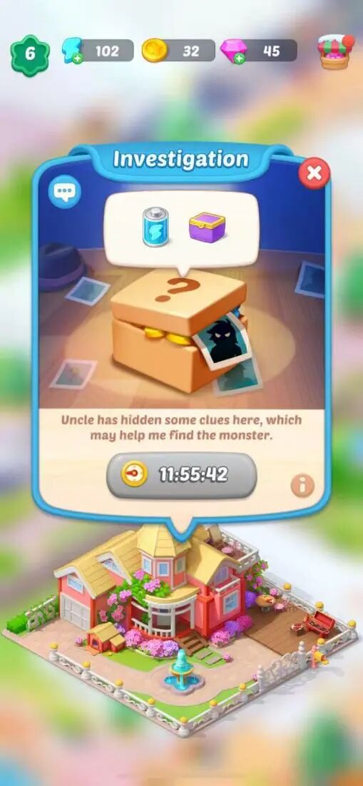 此外,「Mystery Town」还设计了一个新机制“调查”,玩家能让女主在每一个建筑物修复之后进行彻底的检查,从而发现更多的体力和辅助道具,调查的时间大概在 12 个小时左右,游戏还会在调查完成的时候额外推送通知,进一步丰富了资源供给。