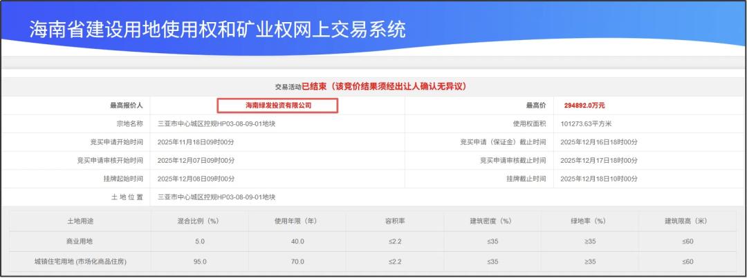 12月18日,中国绿发以底价29.49亿元竞得三亚市中心城区控规HP03-08-09-01地块,折合楼面价约1.32万元/平方米。该地块占地约152亩,容积率2.2,限高60米,北侧临水兼具河景与二线海景资源。