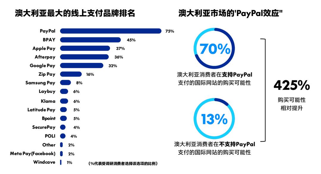 调研显示,可使用PayPal结账是增强澳大利亚消费者线上购物下单信心的因素之一。75%的受调研消费者在过去12个月使用了PayPal进行线上支付,而澳大利亚消费者在支持PayPal支付的国际网站的购买可能性较该网站不支持PayPal的情形相对提升425%。