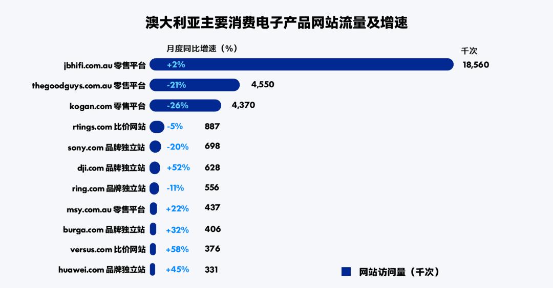 在消费电子市场,澳大利亚消费者喜爱做足研究,通过直接搜索网站了解消费电子产品信息。除了查看电子产品垂直赛道零售网站(如jbhifi.com.au)和比价网站(如rtings.com)以外,许多跨境品牌独立站(如dji.com)的流量月度同比增速也十分可观。这为中国商家出海澳大利亚市场提供了良好的消费氛围和市场基础。