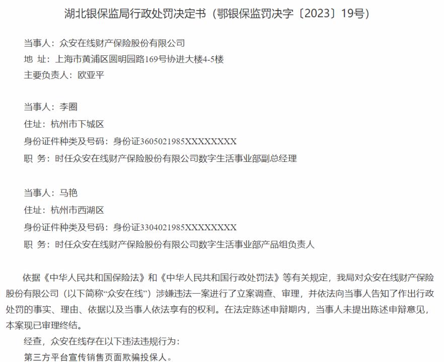 湖北银保监局还指出,2021年7月19日,众安在线因“第三方平台宣传销售页面欺骗投保人”问题,受到过中国银保监会行政处罚(银保监罚决字〔2021〕33号)。