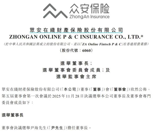 近日,港股上市险企众安在线宣布,第五届董事会第一次会议选举尹海担任董事长,其董事长任期自公告发布之日起,至2028年11月27日共三年。