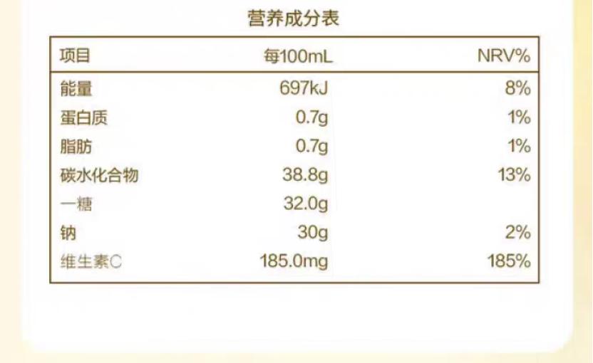 为了中和姜黄和生姜的辛辣味道,市面上的姜黄饮基本都添加了蜂蜜和柠檬等配方,但这并不能提高姜黄素的利用率,反而添加了摄入糖分的负担。以山姆的轻养诺姜黄饮为例,每100ml的含糖量达到32g,是可乐的三倍以上。
