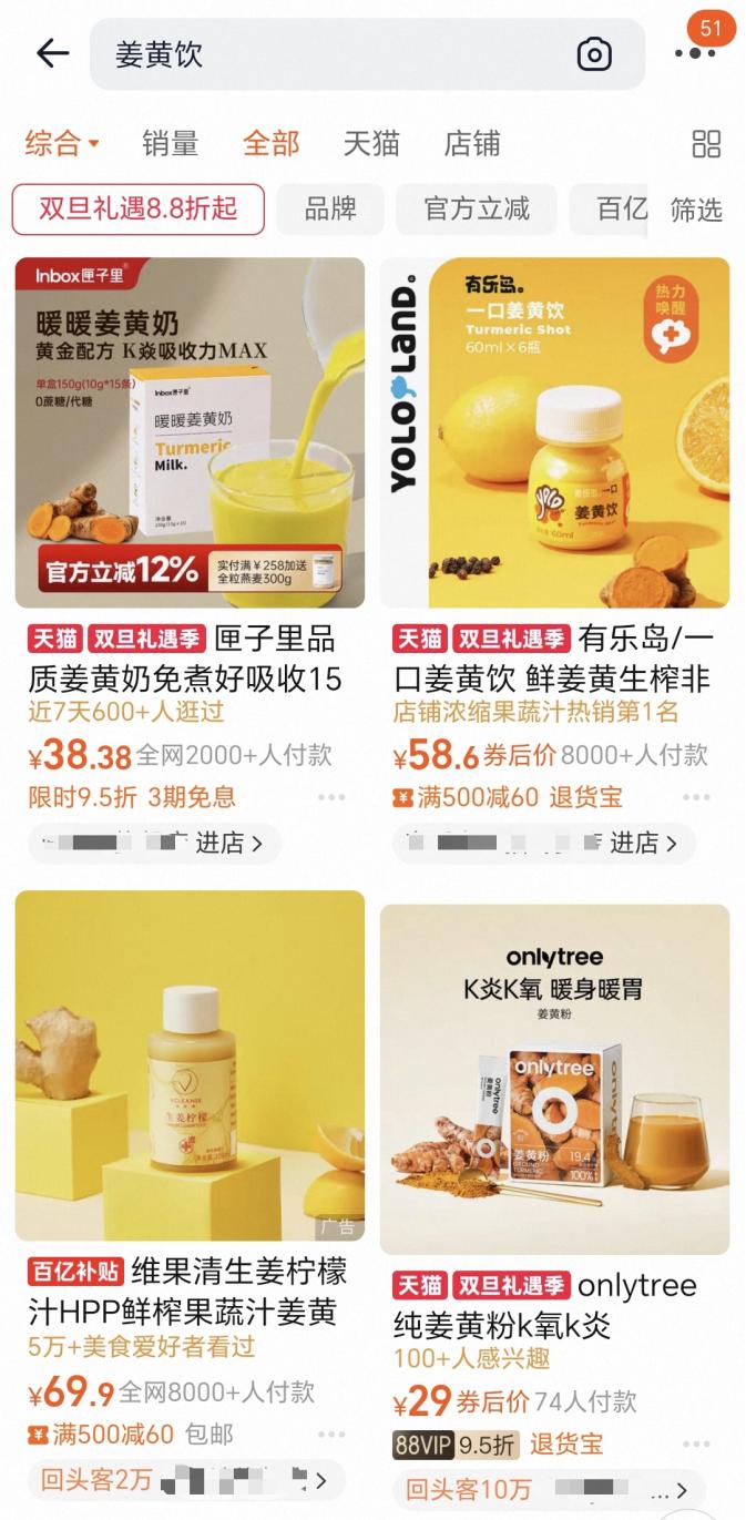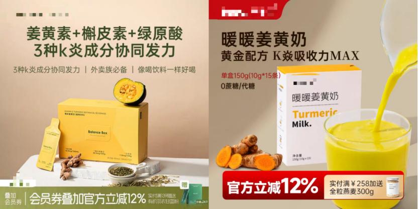 基本每一款姜黄饮都会主打抗炎的功效。(图/电商平台截图)