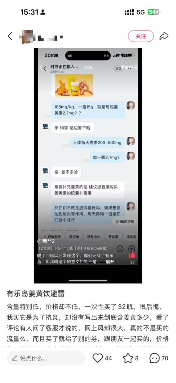 今年四月,网友贴贴一次性网购了32瓶有乐岛的姜黄饮。她购入后发现,该品牌的姜黄饮包装上并没有标注每瓶的姜黄素含量,询问客服后才知道,一瓶15g的姜黄饮,姜黄素含量只有2.7mg。而按照医学标准,姜黄素的每日摄入量通常建议为500~1500mg。