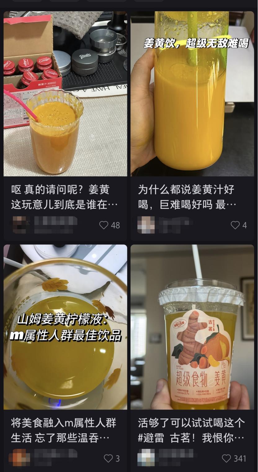即便口感奇怪,仍然挡不住许多对健康问题感到焦虑的年轻人,拖着一身牛马病的残躯“吃草”,心甘情愿为姜黄饮买单。