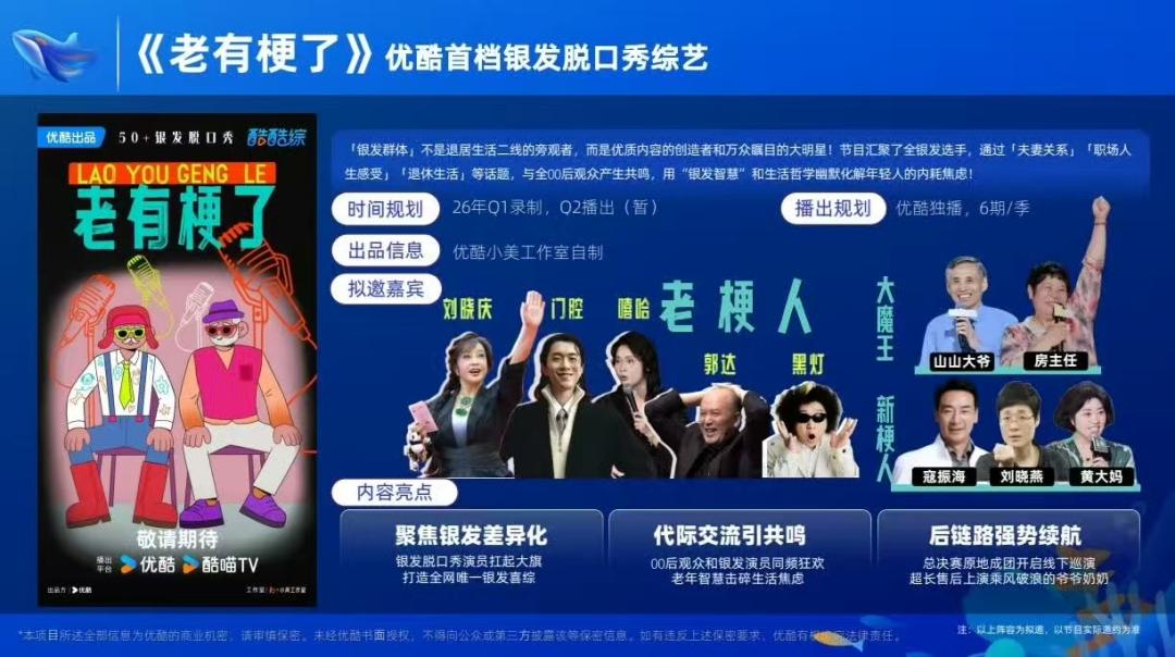 几大平台中,对垂类喜综布局稍显落后的优酷,也在2026年片单中布局了《喜剧之战》《不好笑就露宿街头》《老有梗了》(银发喜剧)等多档节目,显示出对这一赛道向更细分、更专业化方向深耕的决心。