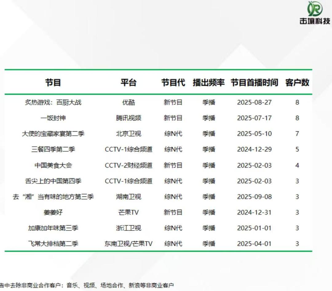 从市场表现看,美食竞技虽非全新品类,但胜在网综的新颖表达,其网感化表达成功撬动了商业价值。灯塔数据显示,《一饭封神》开播日正片市占率峰值达8.61%,《炙热游戏:百厨大战》正片最高市占率达5.29%。更重要的是,它验证了从线上内容到线下消费的闭环能力:节目同款美食在美团团购的订单量周环比激增274%,并成功与上海梅林、旺旺等品牌联合厨师开发超50款联名产品。击壤科技数据显示:两档新综的客户数均达到8个,超过了《舌尖上的中国第4季》等综N代。