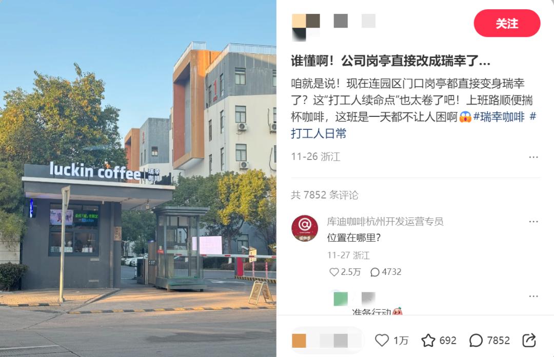 最近,浙江嘉兴一工业园区门口的岗亭,悄然挂上了瑞幸的招牌,从保安室摇身变成迷你咖啡店,这种反差场景迅速引爆社交网络。