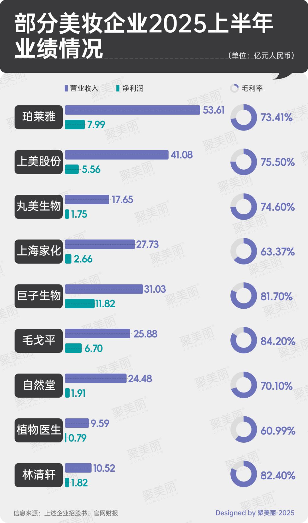 2025上半年,作为国货美妆龙头的珀莱雅营业收入超50亿元,港股上市的上美股份和巨子生物位列第二、第三。目前处于上市进程的自然堂,营收也即将赶超毛戈平,反观植物医生和林清轩营收只处于10亿量级徘徊。