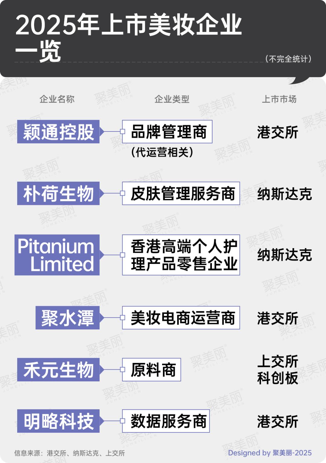 从今年上市的企业来看,其都具备聚焦细分赛道的优势、清晰的定位与成熟的商业运营模式。它们分别是手握爱马仕、宝格丽等合作的品牌管理公司颖通控股、专业化皮肤管理服务商朴荷生物、香港高端个人护理产品零售公司Pitanium Limited、美妆电商运营商聚水潭、重组胶原蛋白企业禾元生物以及数据服务商明略科技。
