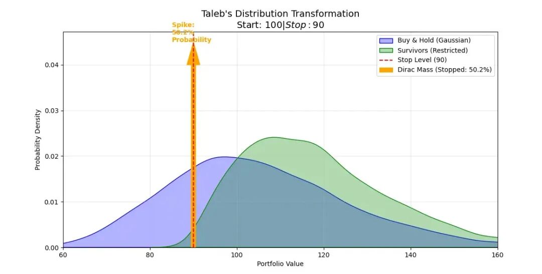 横坐标是组合收益率,纵坐标是获得该收益率的概率,紫色的曲线是不止损状态下的收益率分布,是一个标准的正态分布,概率峰值出现在微亏(交易费用)的位置,两边收益或损失越高,发生的概率越低。