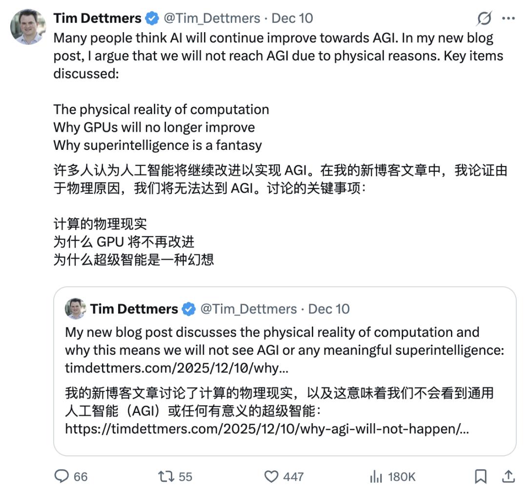 博客链接:https://timdettmers.com/2025/12/10/why-agi-will-not-happen/