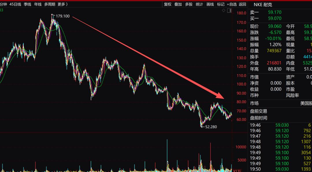 资本市场早已闻风而动。12月12日,耐克股价从最高68.35美元/股开始持续下行,截至12月19日,股价为65.63美元。若拉长时间轴,很容易发现,耐克股价较其2021年12月巅峰时,目前已经腰斩,市值蒸发了60%左右。