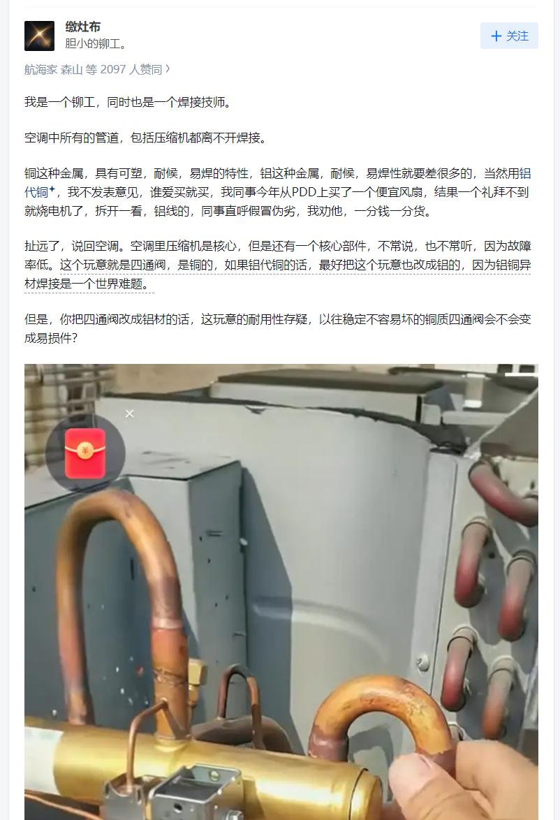 近期有自称为铆工,也是焊接技师的用户提醒空调行业:“用铝代铜,我不发表意见,我同事今年从某电商买个便宜风扇,结果一个礼拜不到就烧电机了,拆开一看,铝线的,我劝他,一分钱一分货。空调里压缩机是核心,但是还有一个核心部件,不常说,因为故障率低。这个玩意就是四通阀,是铜的,如果铝代铜的话,最好把这个玩意也改成铝的,因为铝铜异材焊接是一个世界难题。”